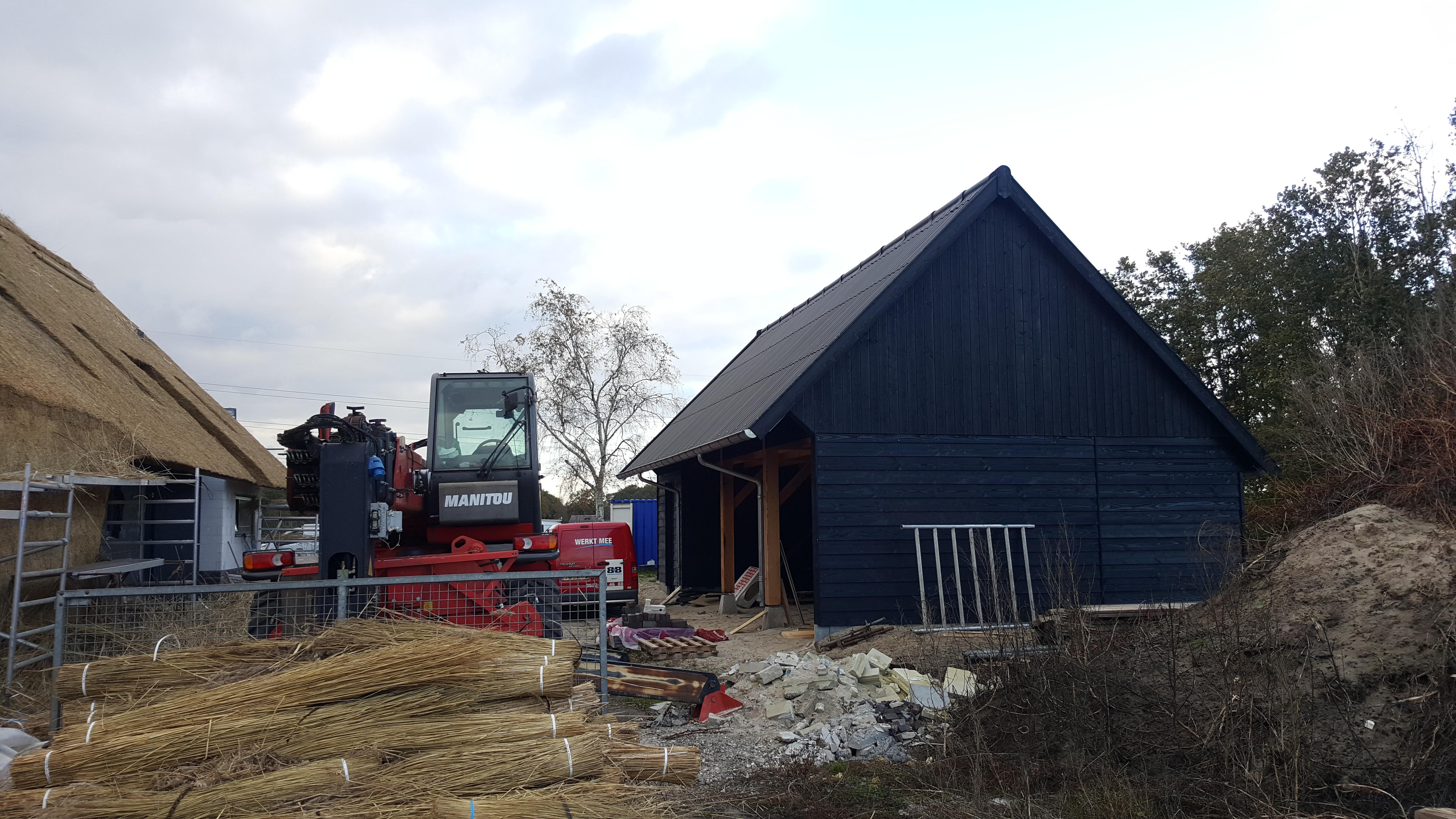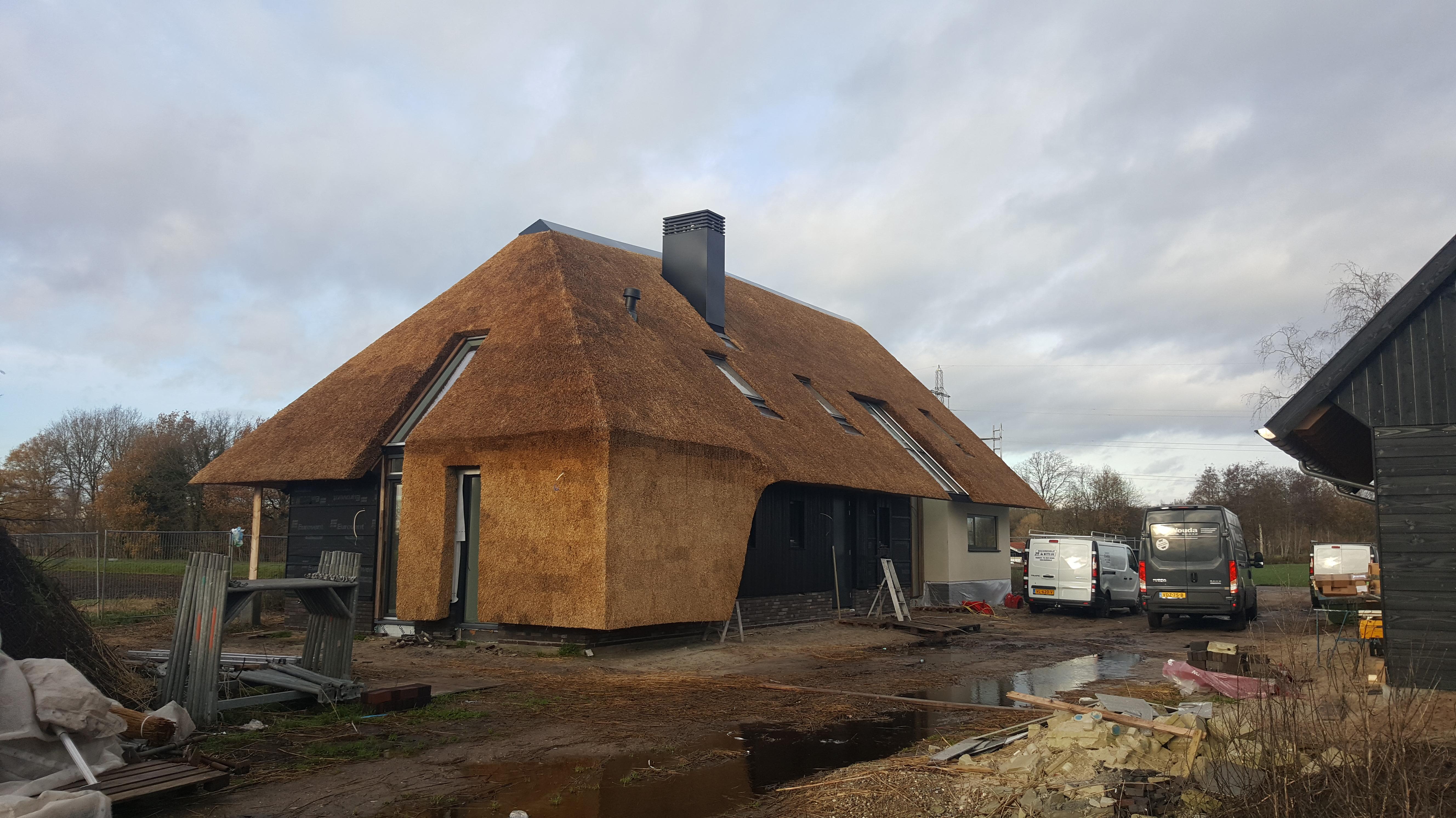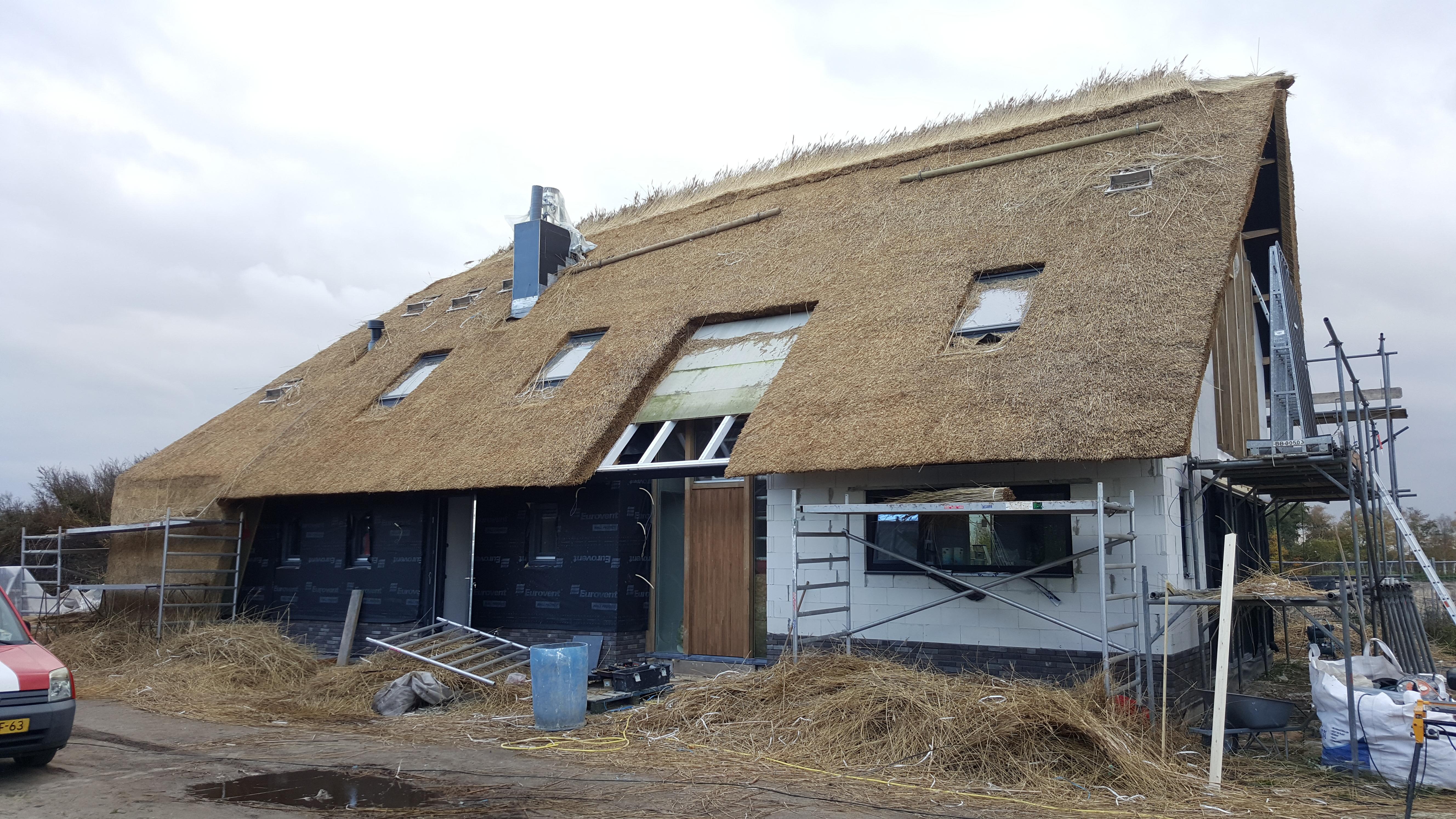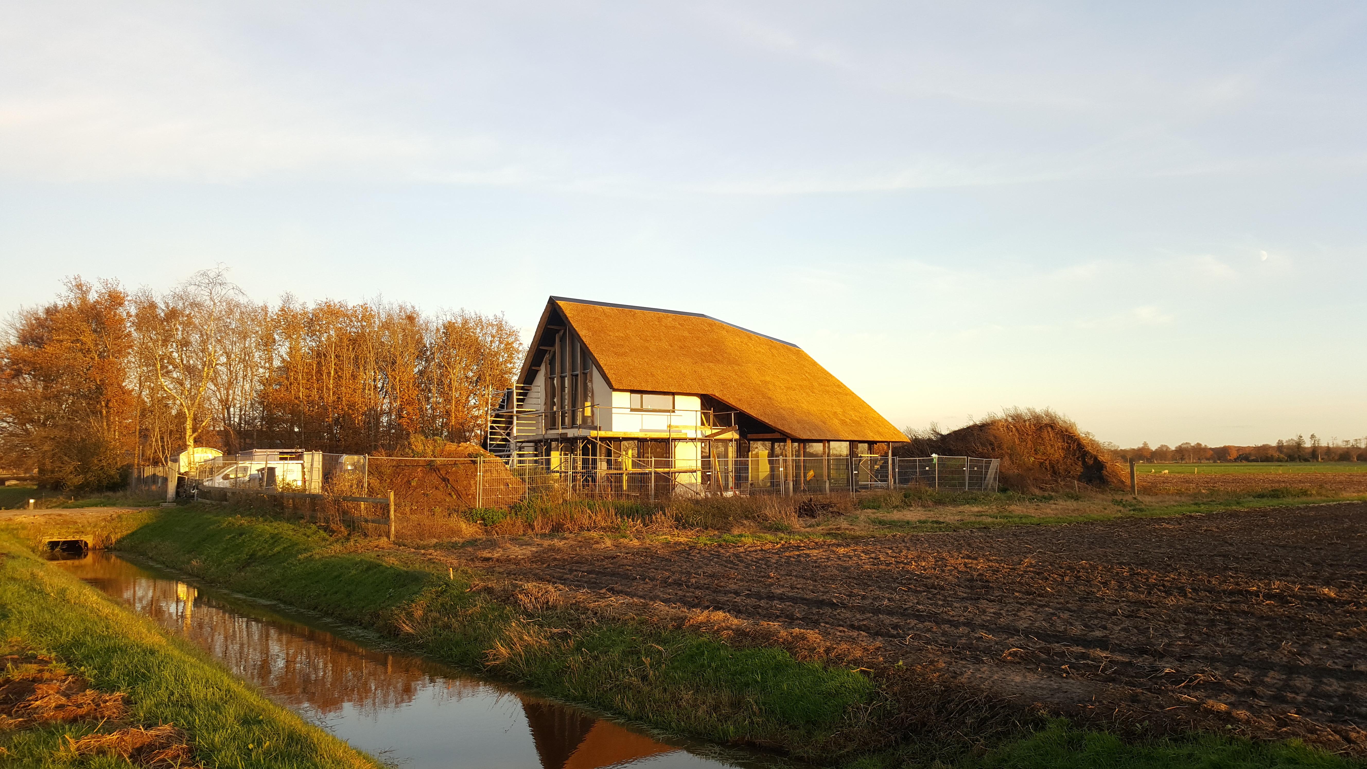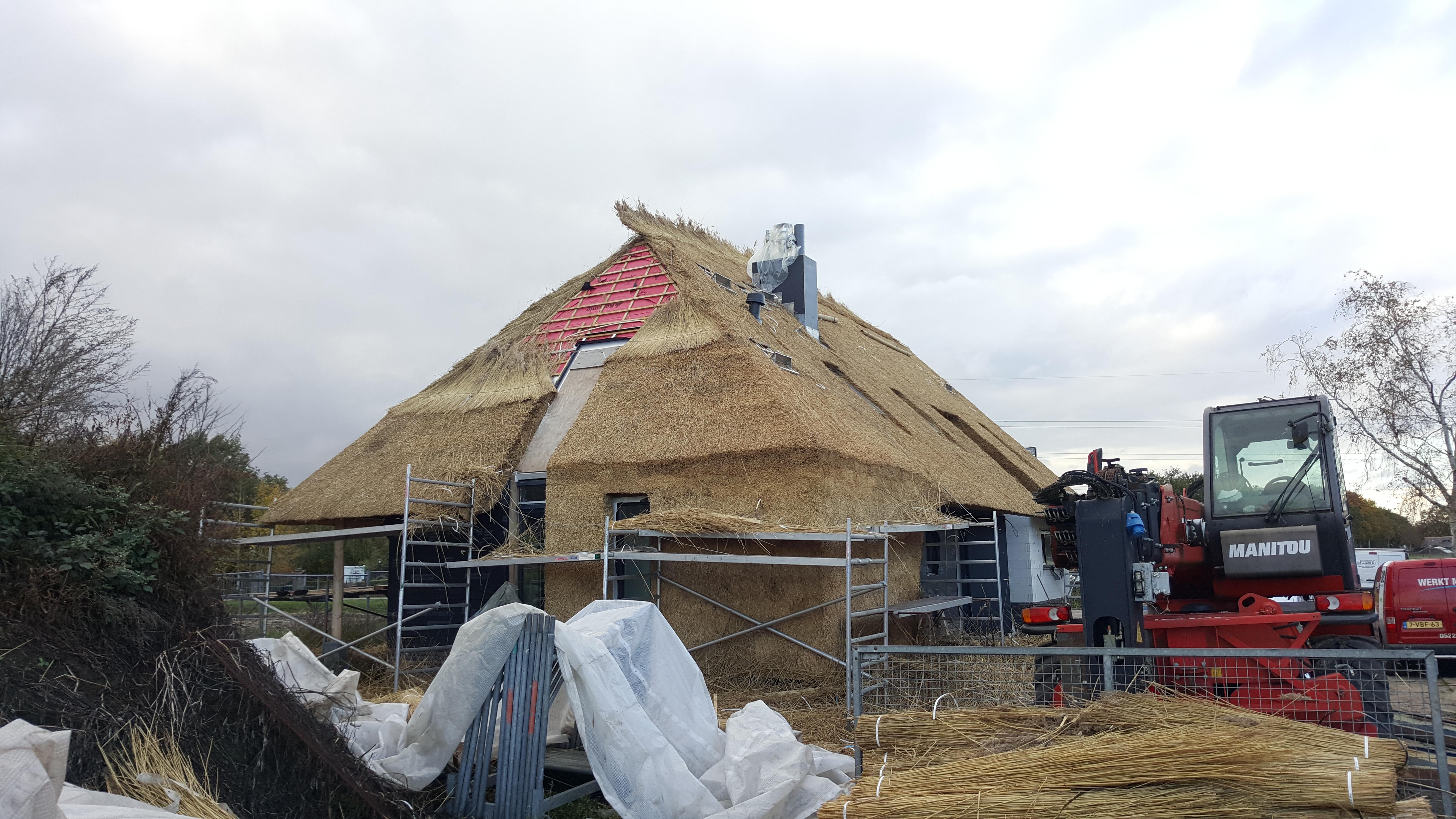 Aan de Fortiwjk in Veeningen wordt hard gewerkt aan de afbouw van het moderne rietgedekte landhuis.