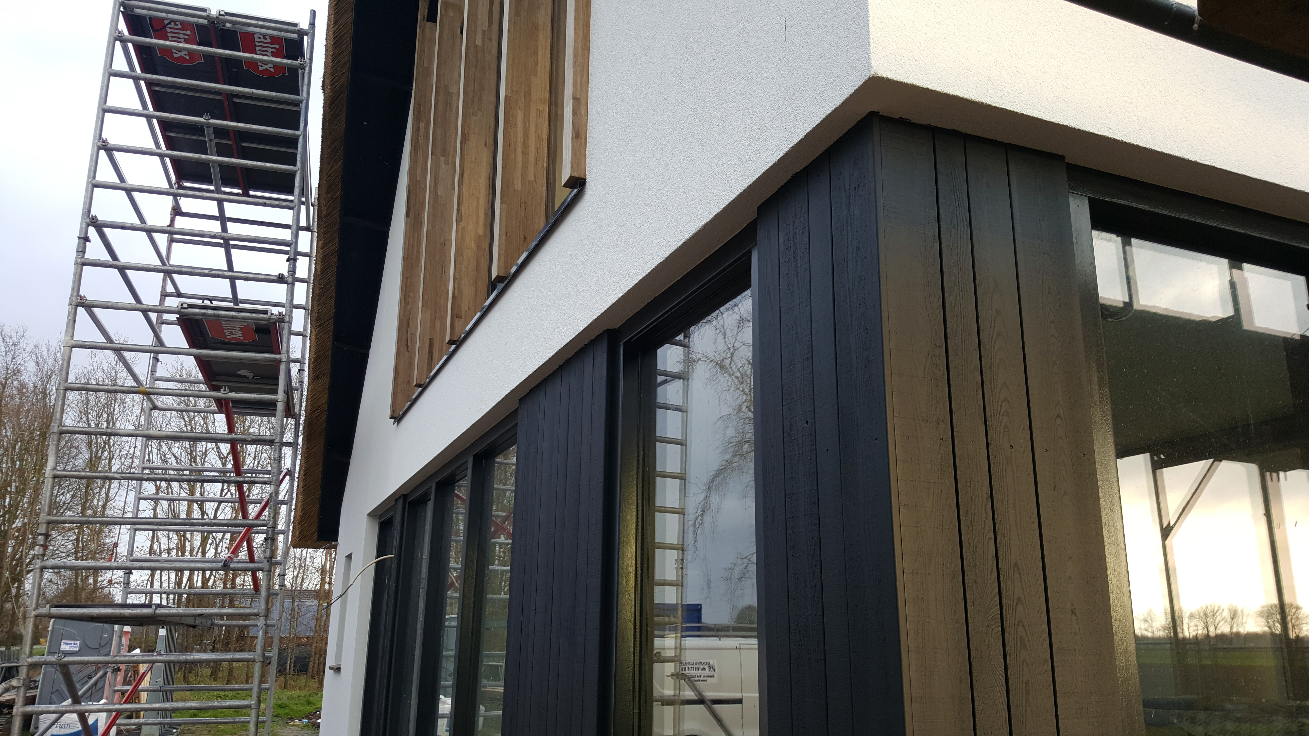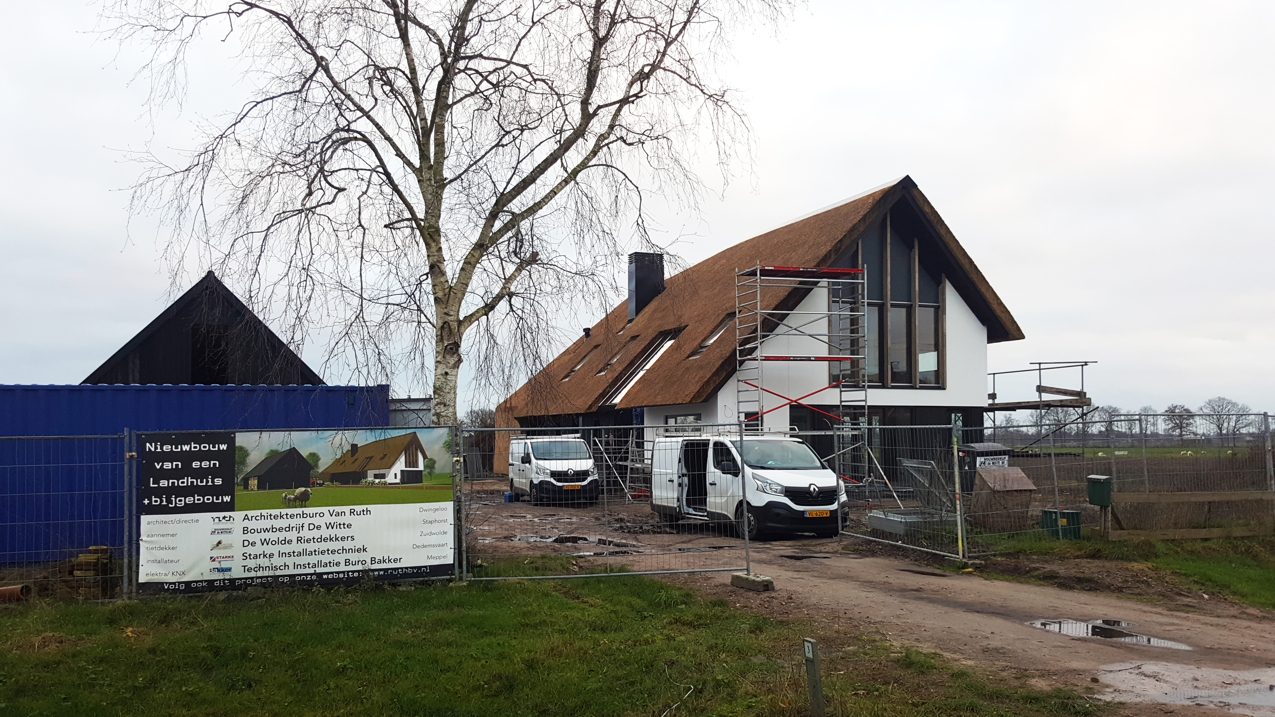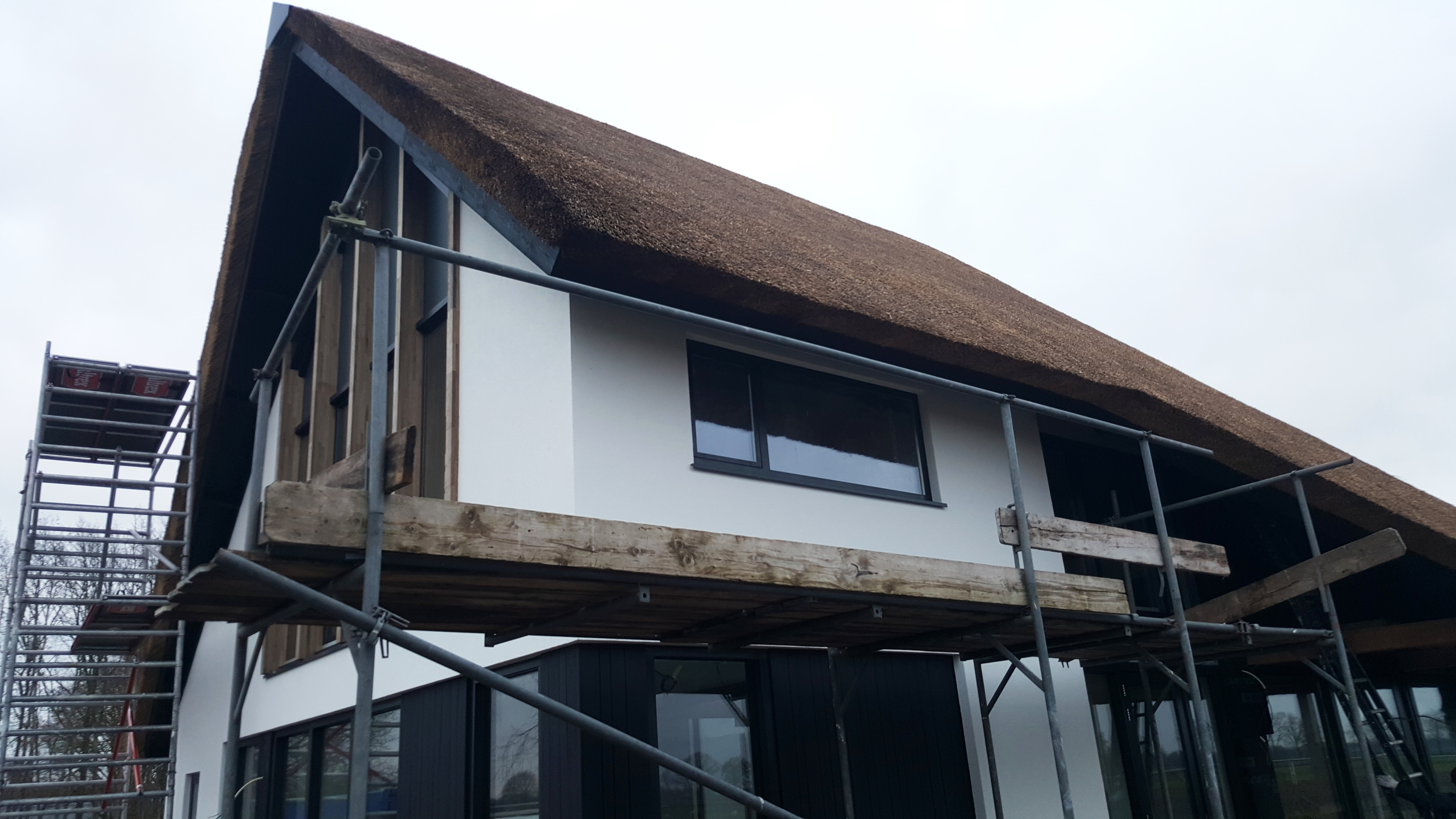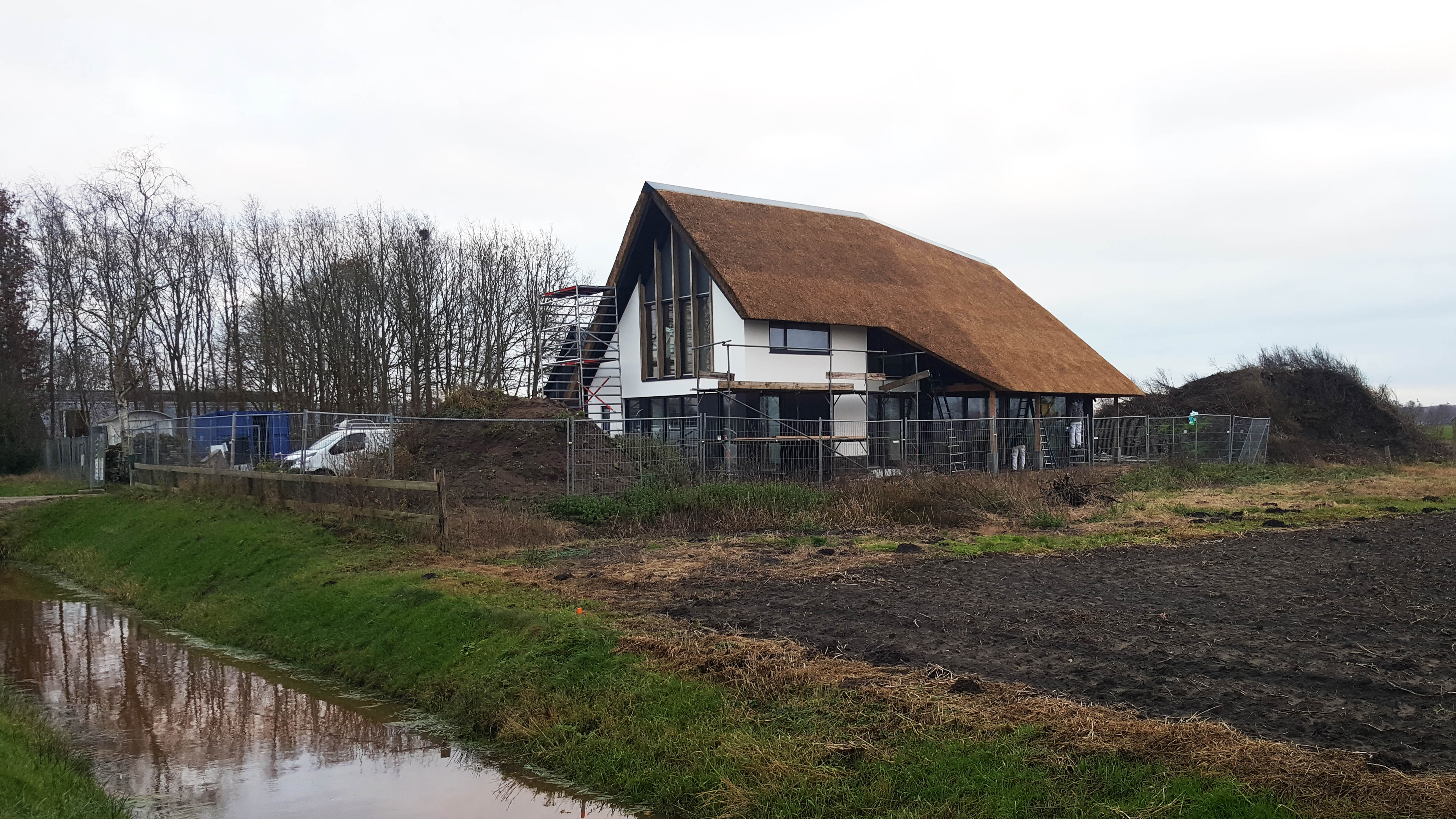 Aan de Fortiwjk in Veeningen wordt hard gewerkt aan de afbouw van het moderne rietgedekte landhuis.