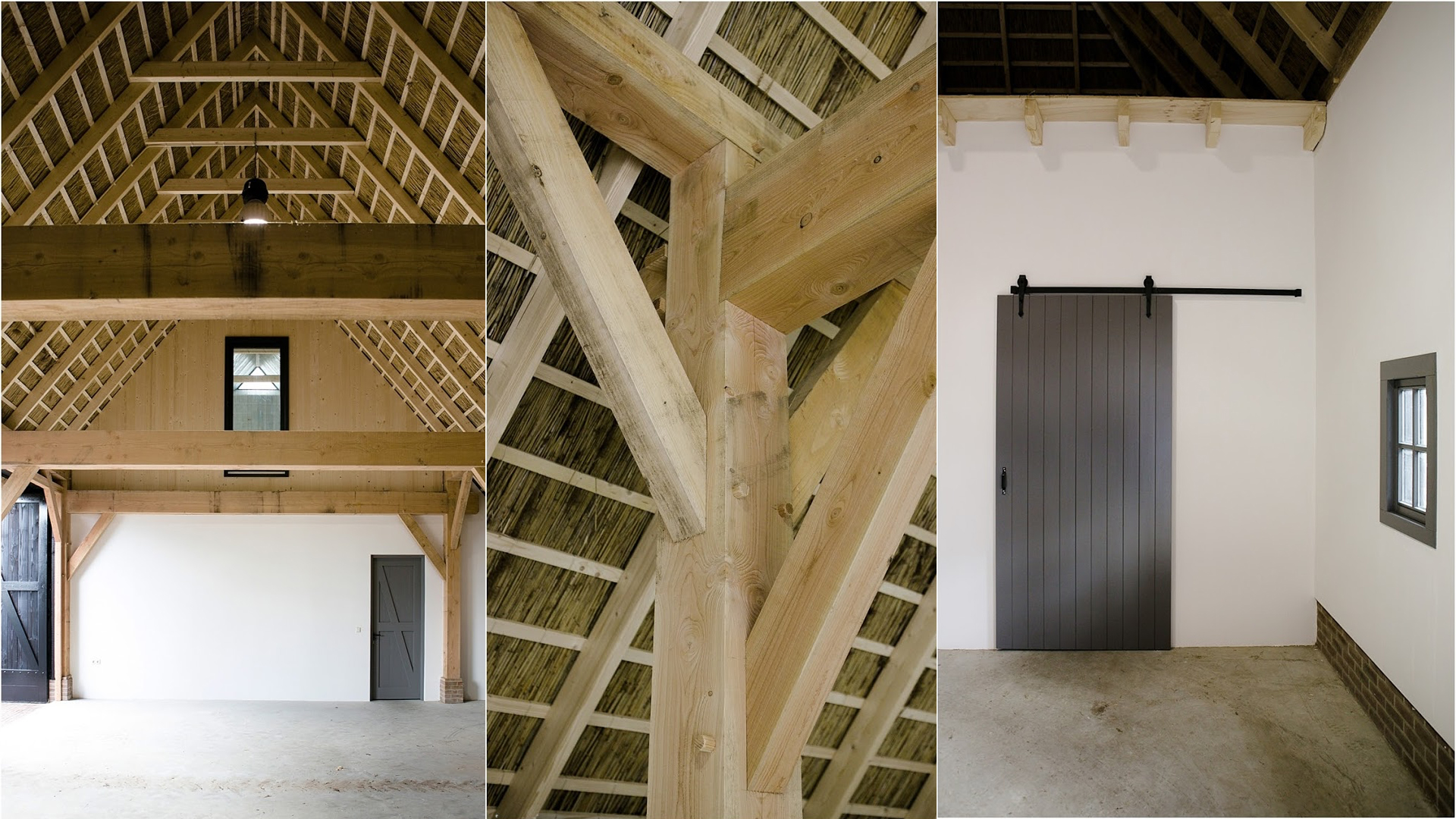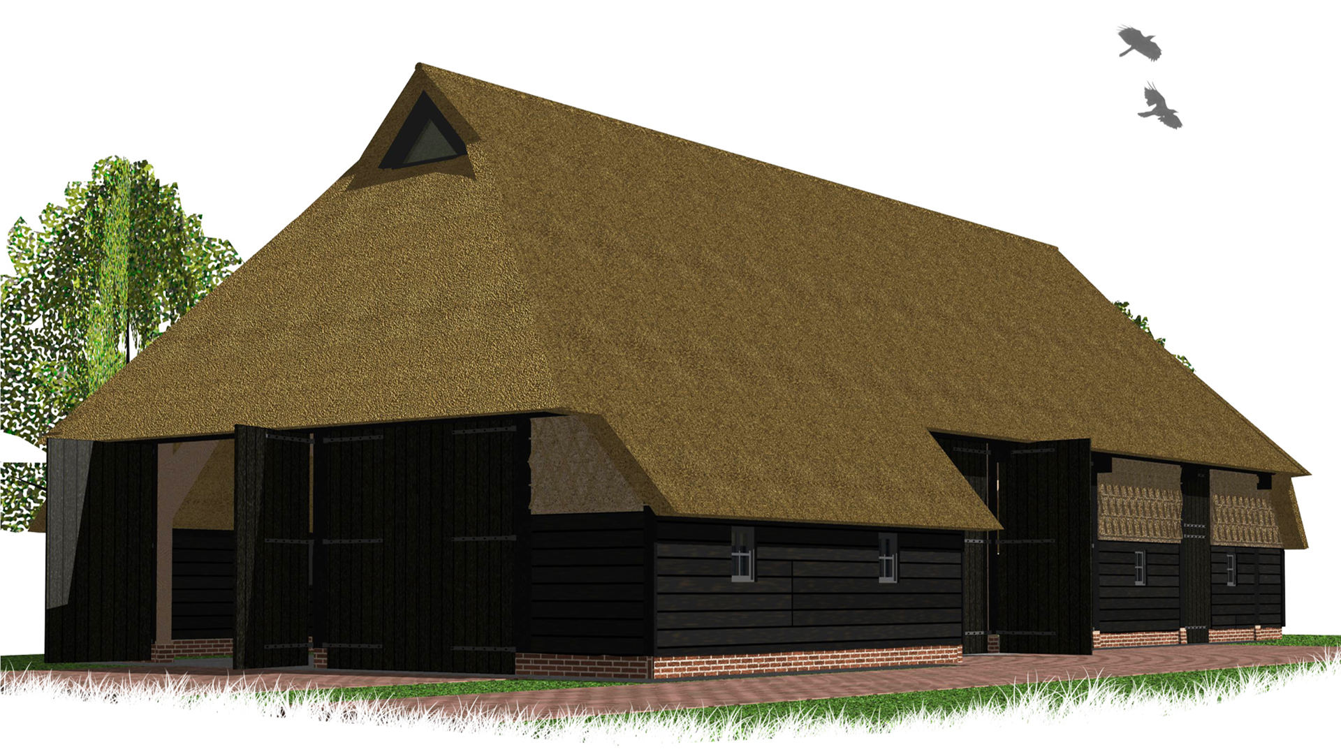 Door de traditionele bouw, voorzien van een gebintenconstructie, de zwarte houten dleen aan de gevel, het rietvlechtwerk en de rieten kap past de nieuwe schuur mooi op in de omgeving.