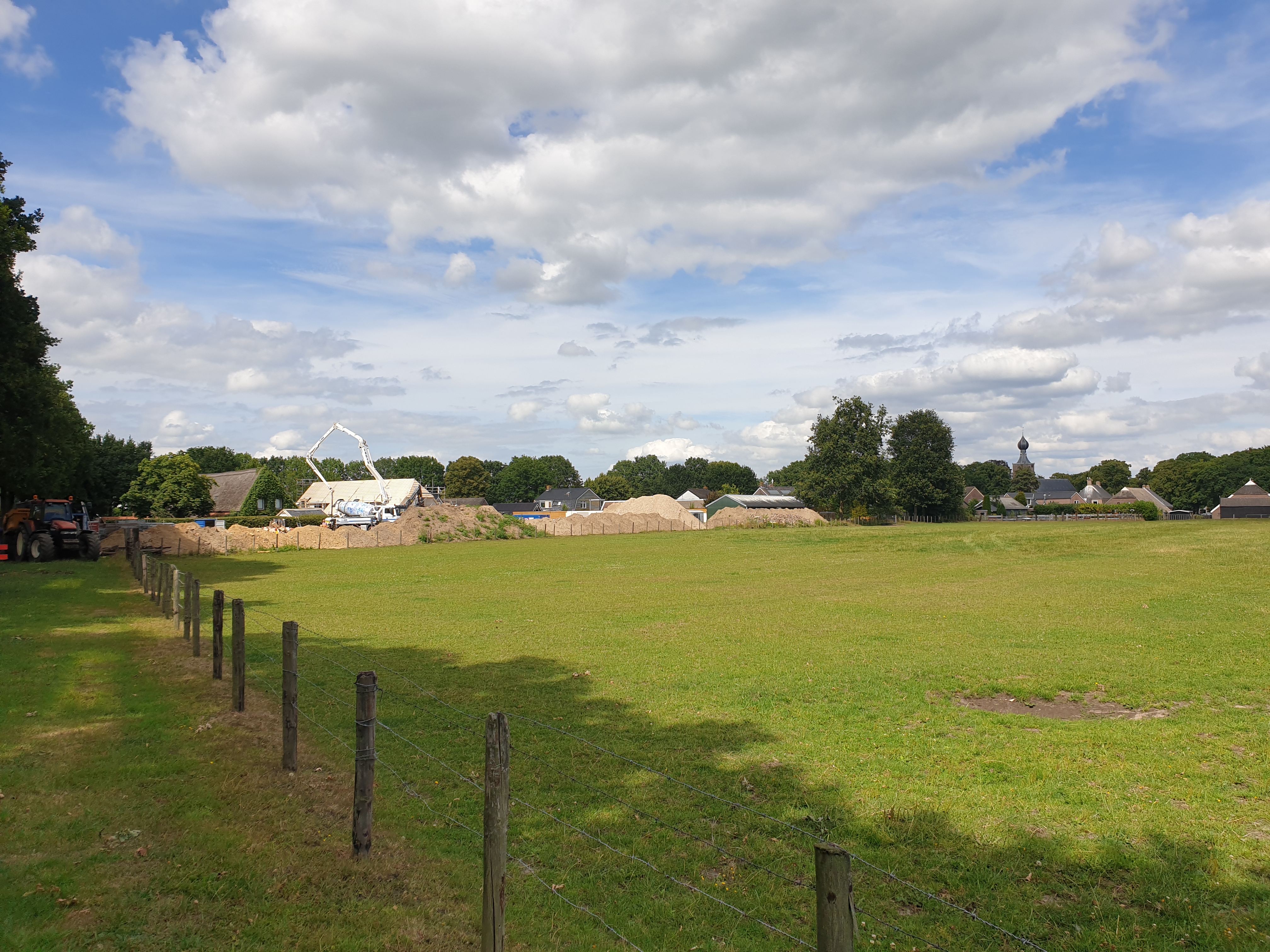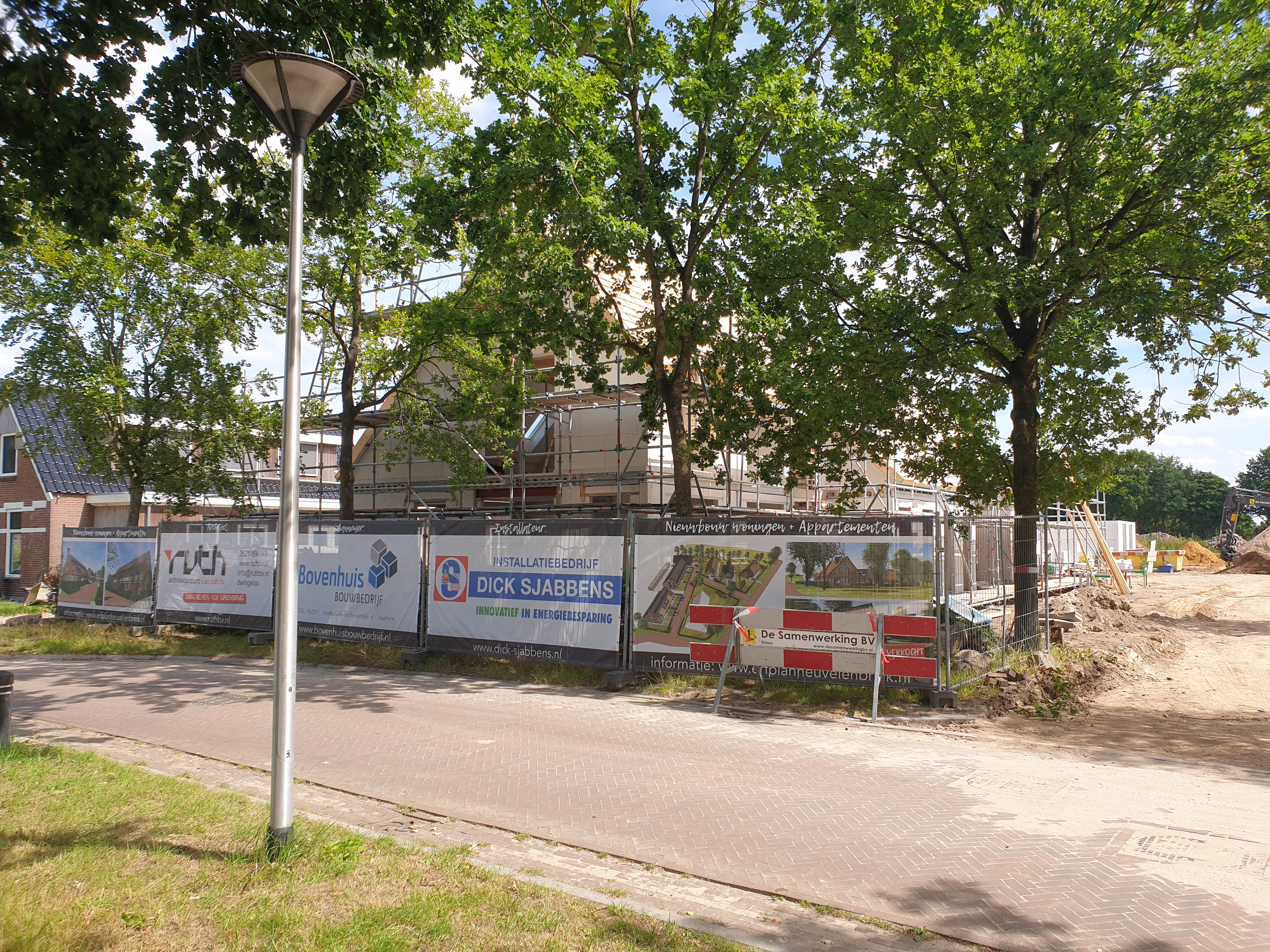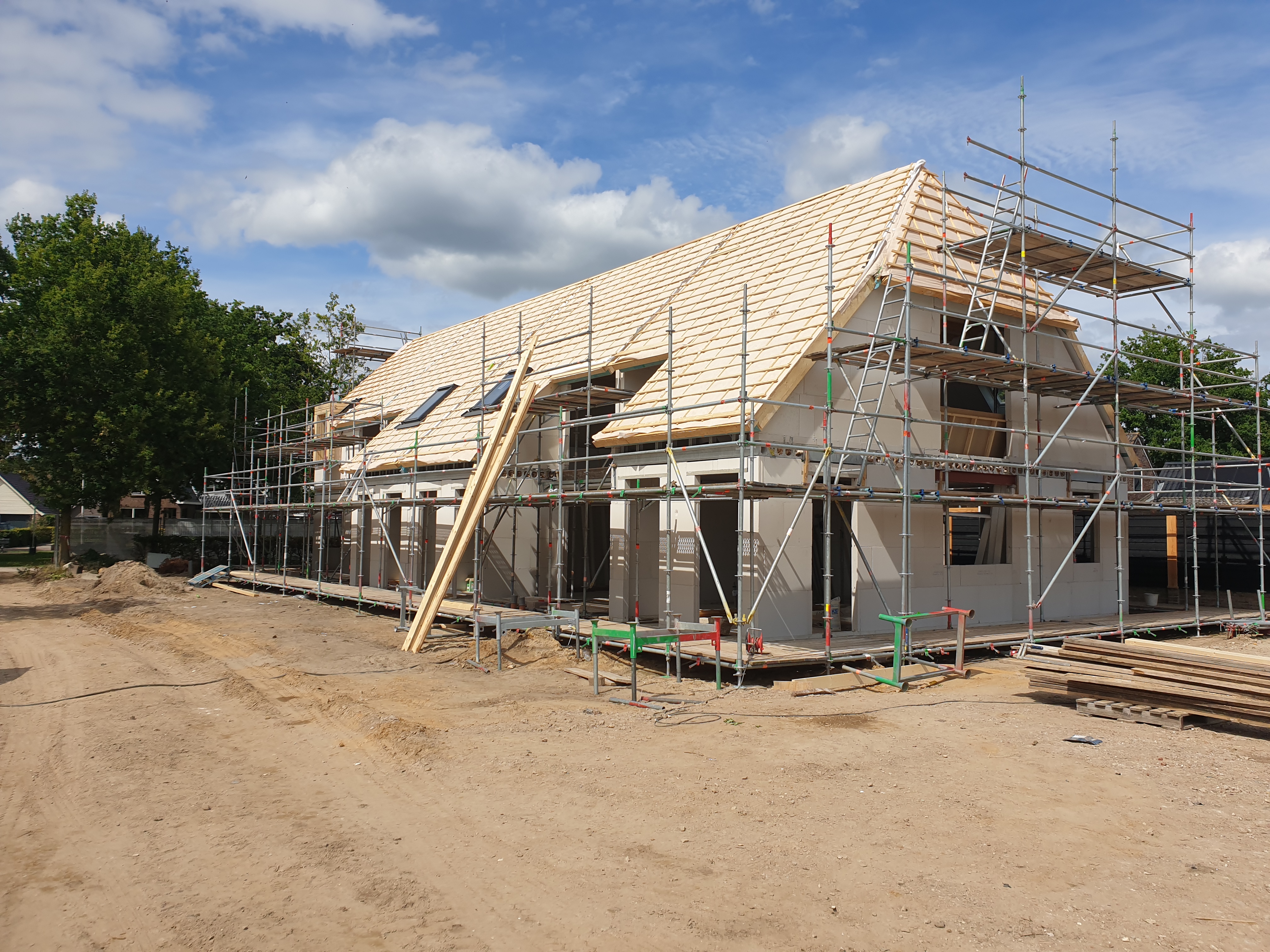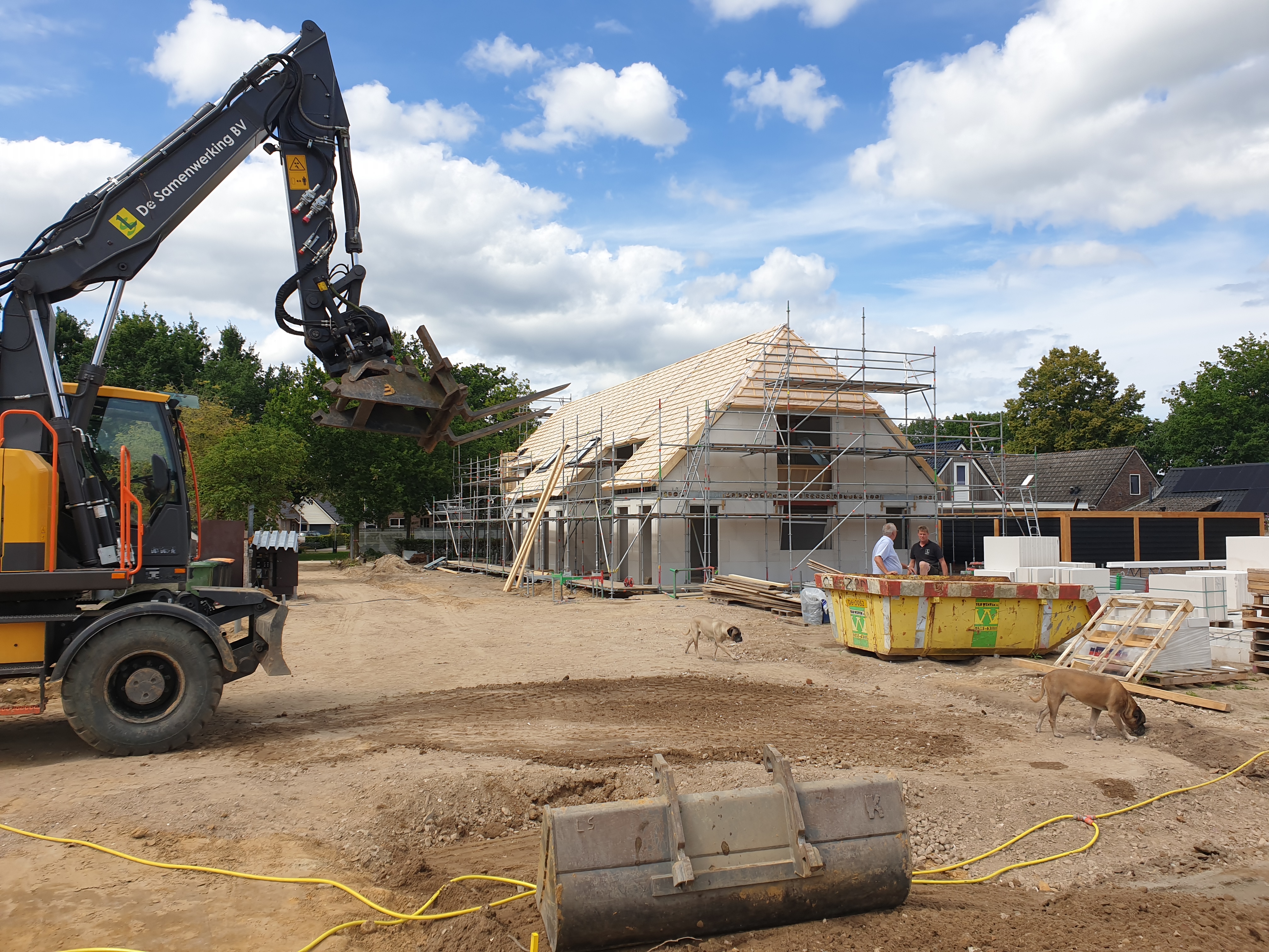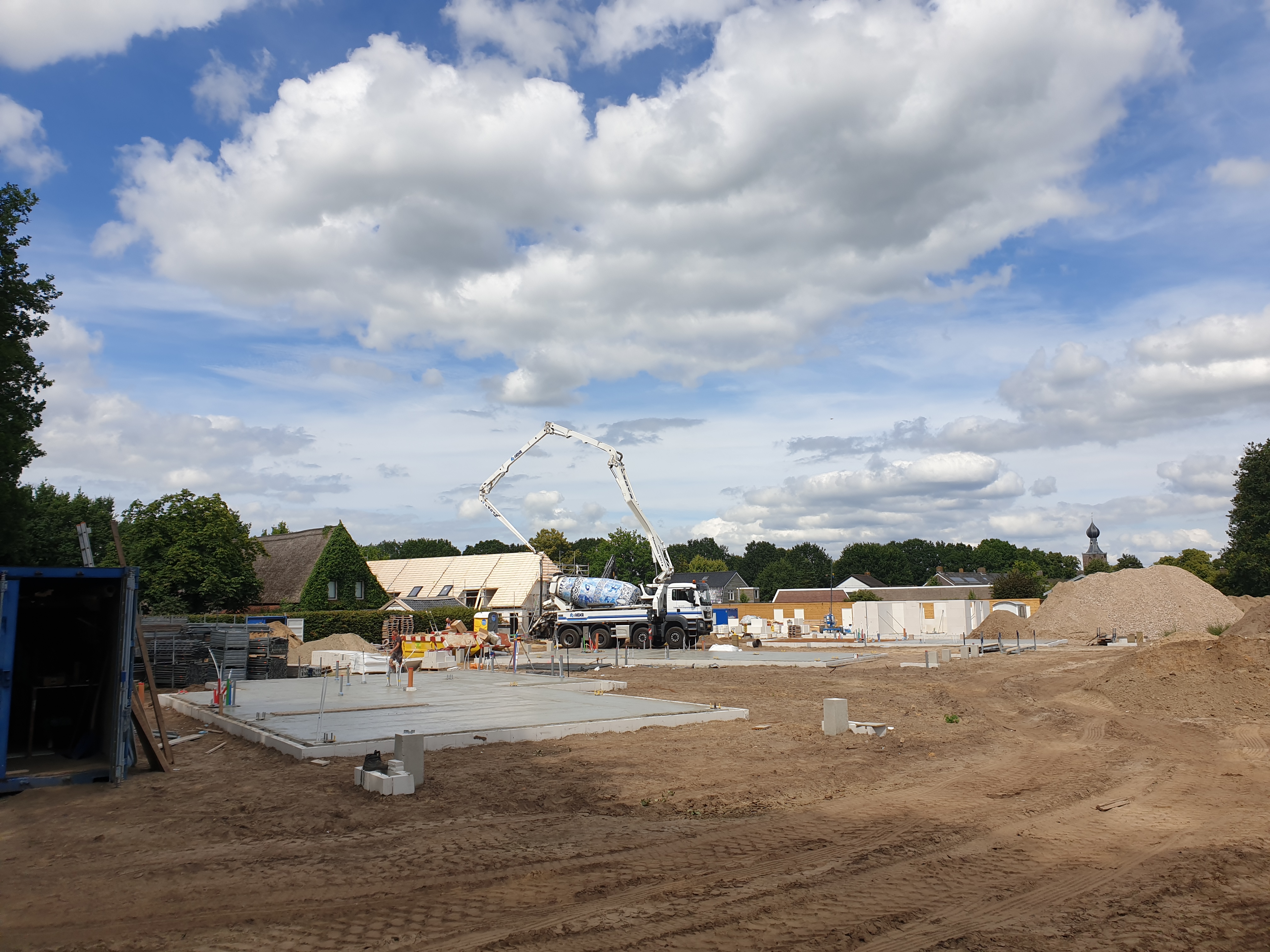 Vandaag is de prefab kapconstructie van de vier geschakelde woningen geplaatst, worden de binnenwanden het appartementengebouw opgetrokken en zijn de betonvloeren van de vrijstaande woningen gestort. Na de bouwvak zal de aannemer beginnen met het opgaande werk van de vrijstaande woningen.