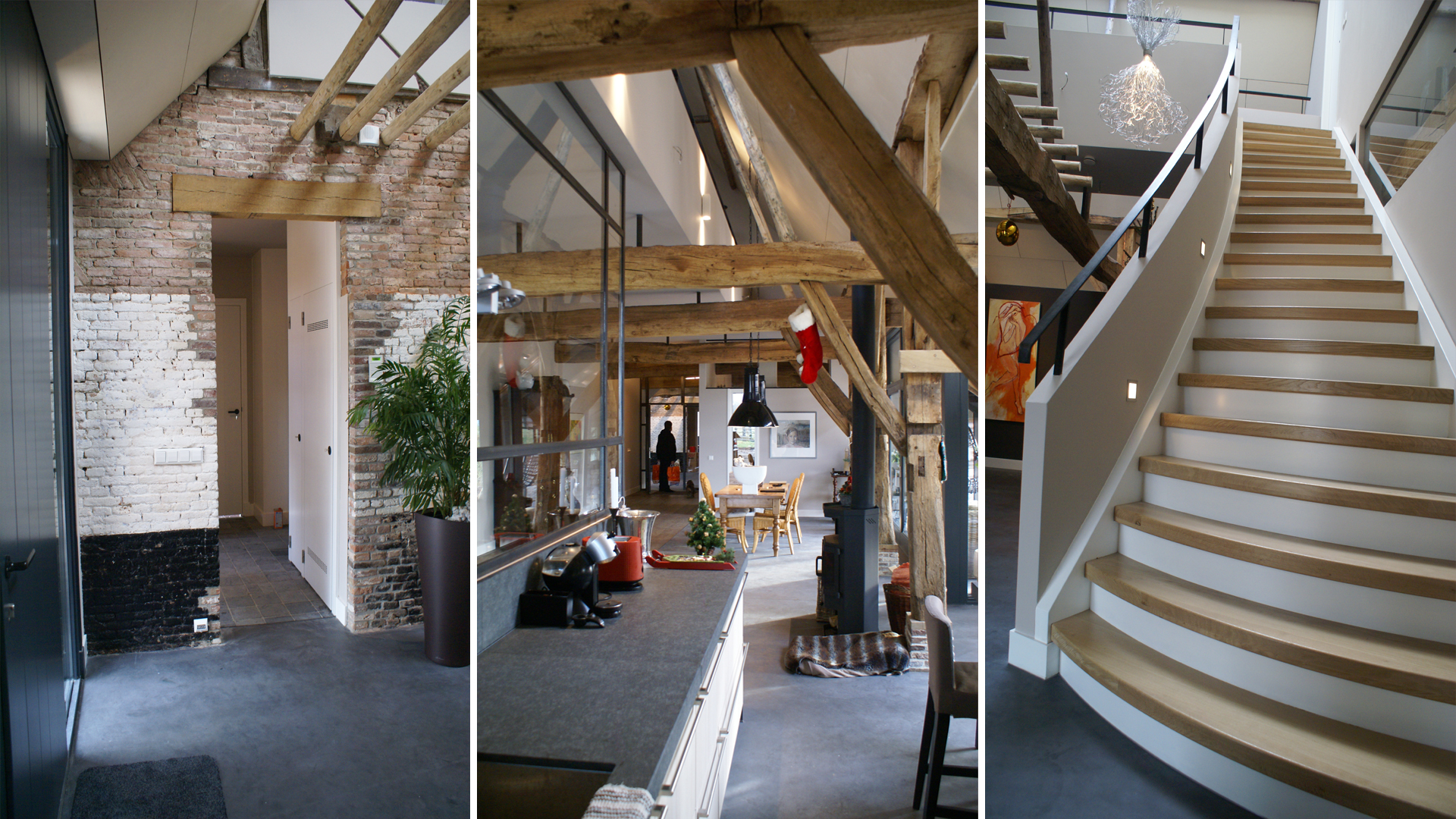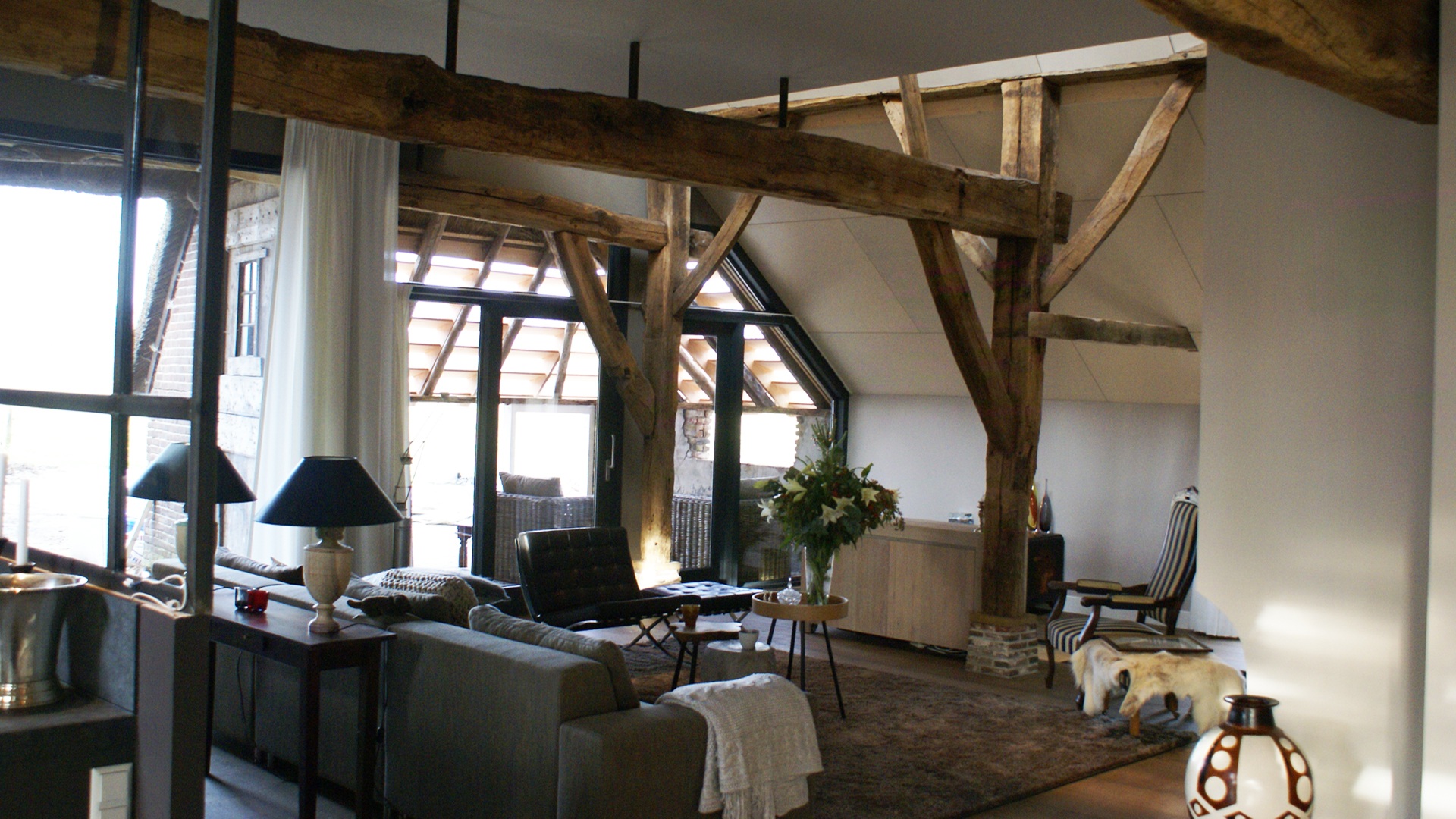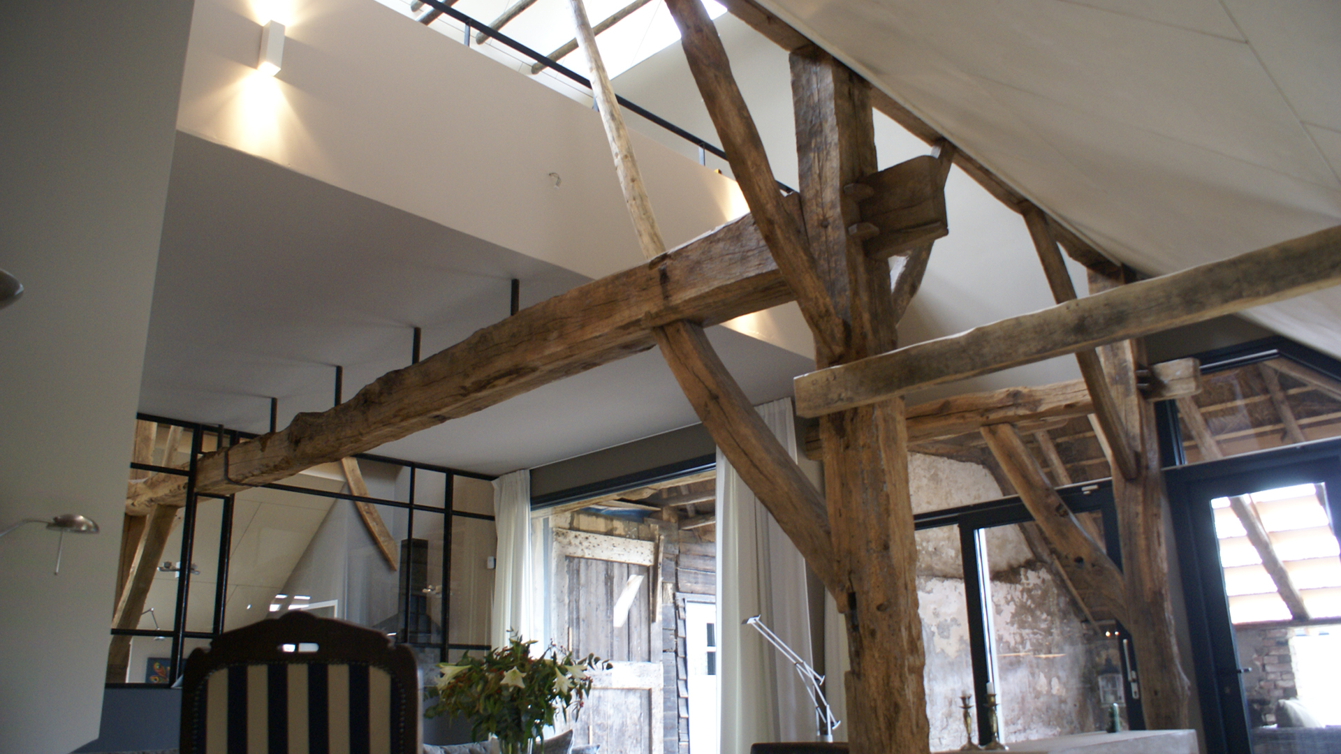 Deze monumentale boerderij is intern geheel verbouwd, de voormalige deel bied nu ruimte voor een woonkamer, keuken, slaapkamers, badkamers, bibliotheek en de nieuwe entree.