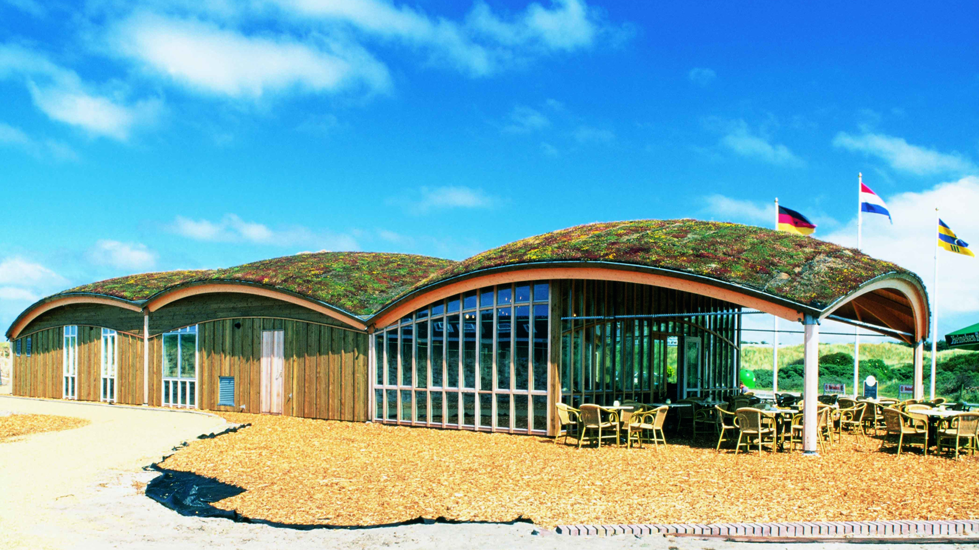 Op een unieke ligging direct aan het noordzeestrand bij Nes, met aangrenzend een prachtig bos- en duinengebied staat dit centrumgebouw op camping Duinoord. Hierin is o.a. een supermarkt, restaurant, fietsenverhuur ondergebracht. Het gebouw bestaat uit verschillende elementen/koepels die aan elkaar zijn gekoppeld en varieren in hoogte. De gevels zijn uitgevoerd in hout en het dak bestaat uit mossen en sedums. Het geheel vormt een prachtig geheel met de omliggende duinen.