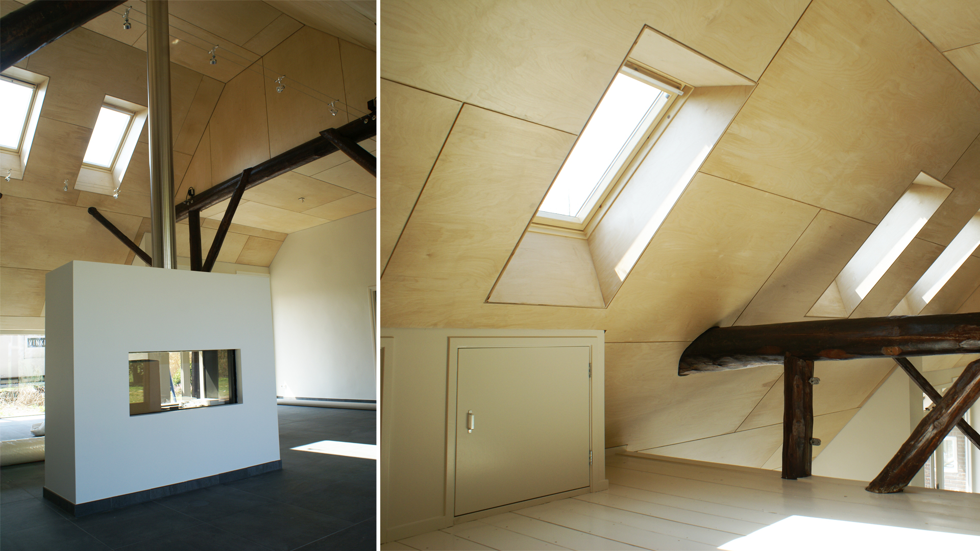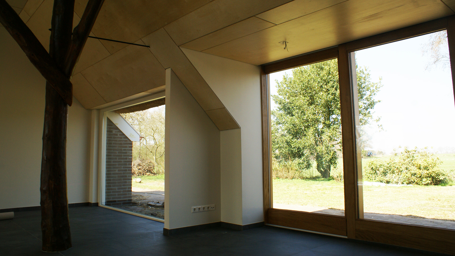 Hoge eikenhouten uitbouwkozijnen aan de lage achtergevel zorgen voor meer licht en openheid en geven een mooi uitzicht op de prachtige omgeving. Met materialen als tegelvloeren, berken triplex, plafonds en strak stukwerk is een modern interieur gecreëerd dat contrasteert met enkele authentieke elementen zoals de gebinten in de woonkamer.