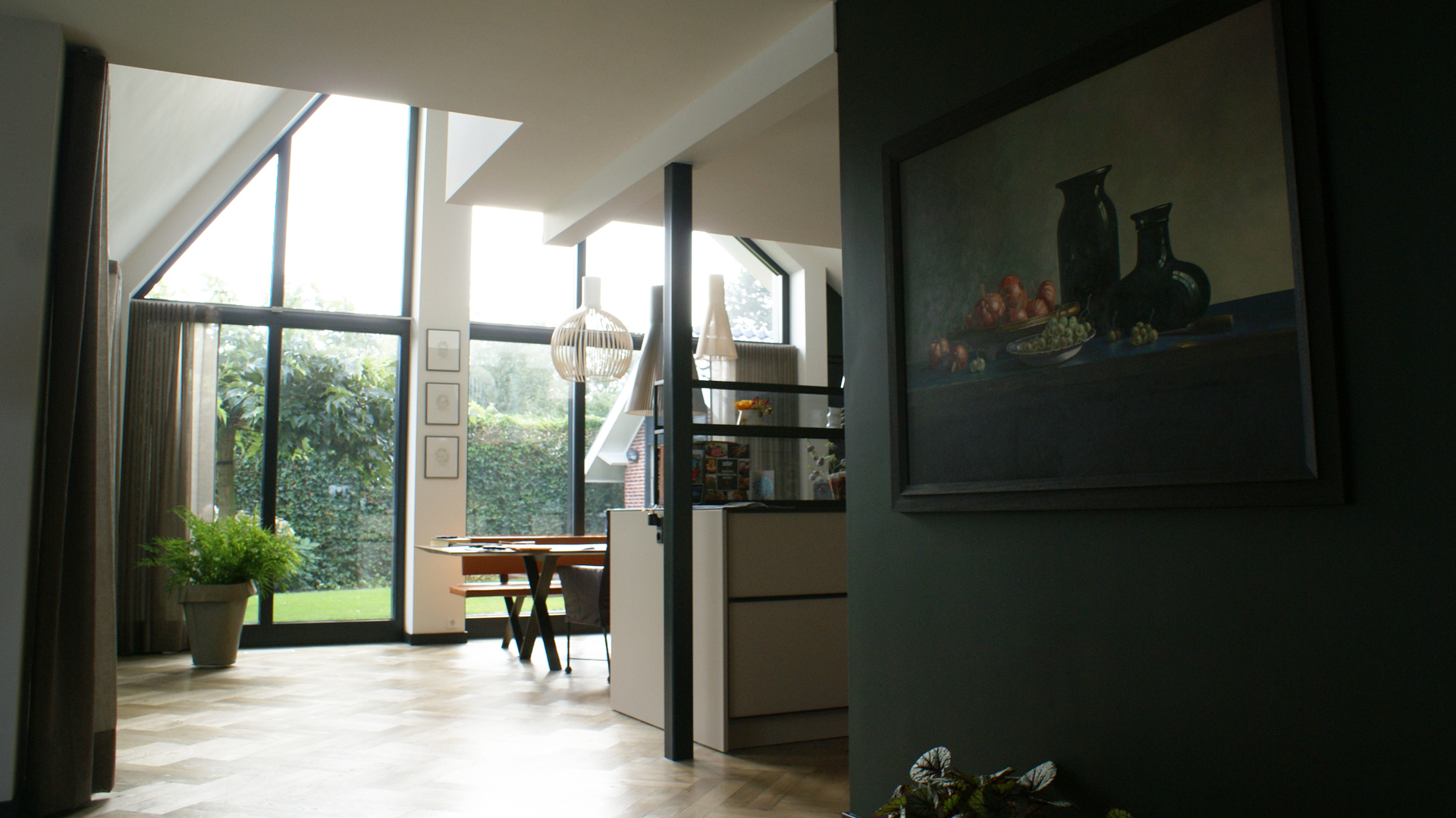 In de uitbreiding, waarin puien zijn geplaatst tot in de nok, is slechts deels een verdiepingsvloer aangebracht waardoor er een ruime lichte leefruimte is ontstaan.