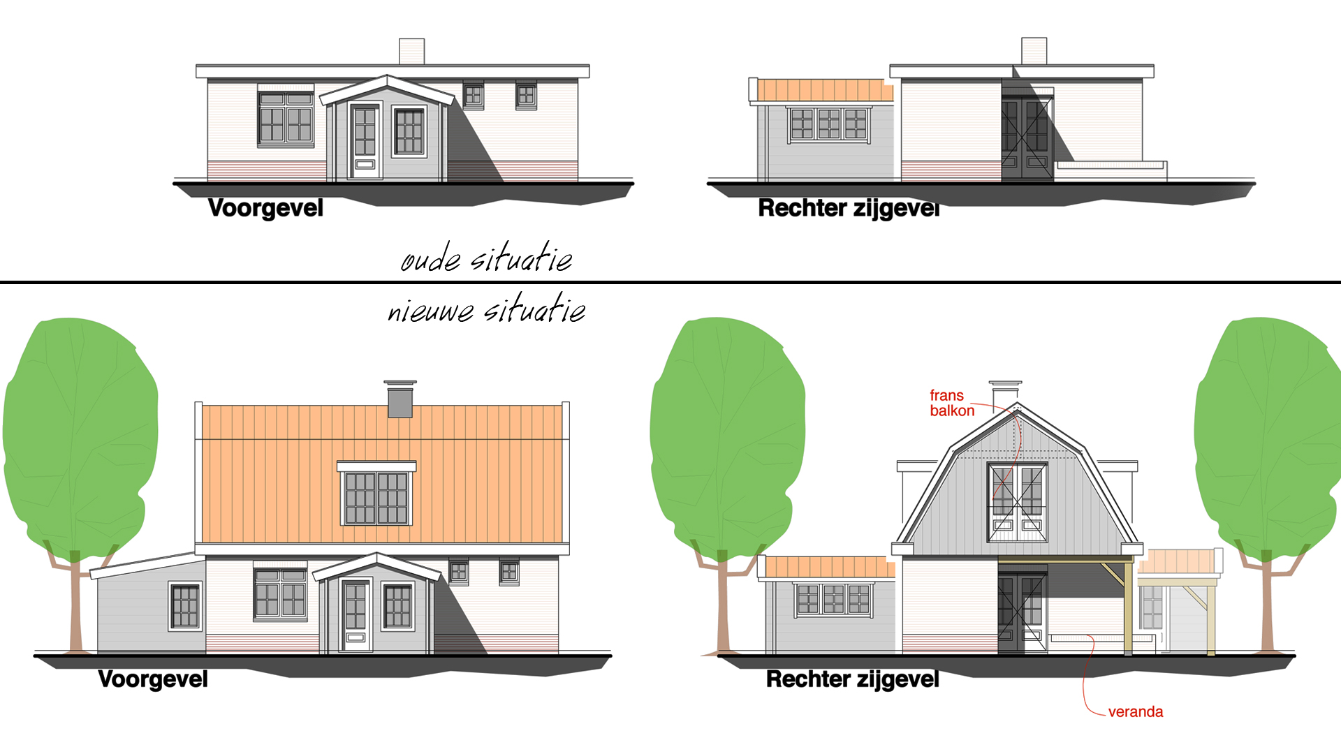 De bestaande vakantiewoning bestond slechts uit één bouwlaag, deze is voorzien van een verdieping. Om voldoende leefruimte te realiseren is er een mansardekap geplaatst met meerdere dakkapellen.