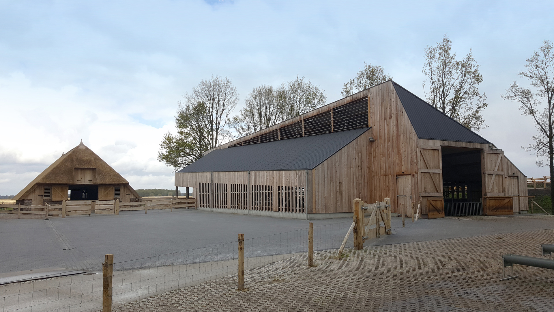 De nieuwe bebouwing is strak vormgegeven en gedetailleerd, als monolithische volumes. Er zijn geen dakoverstekken en de goten zijn weggedetailleerd, de deuren zijn uitgevoerd in hetzelfde hout als de gevels. De volumes blijven hierdoor enerzijds sober en eenvoudig maar anderzijds ook krachtig en markant. De eigentijdse en niet historiserend vormgegeven gebouwen vormen samen met de bestaande kooi een ingetogen ensemble waarbij de bestaande kooi de blikvanger blijft.