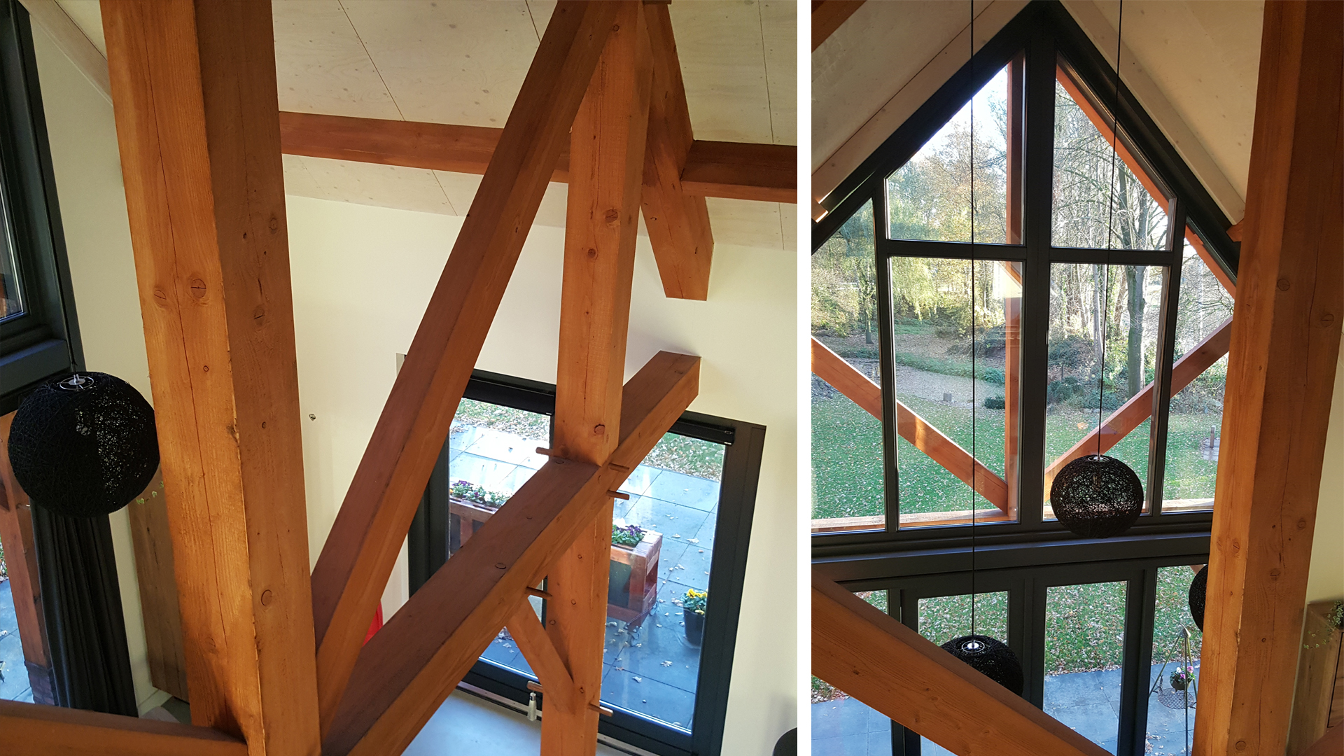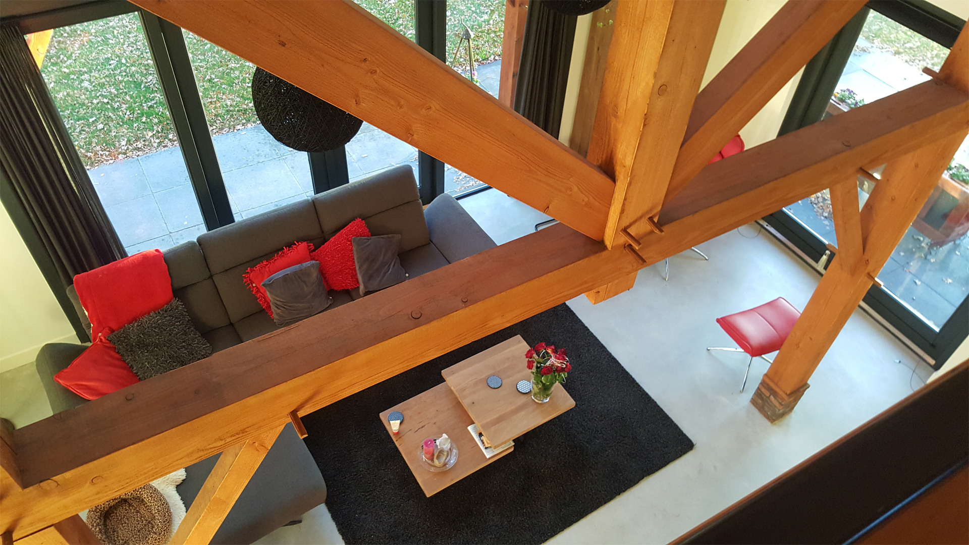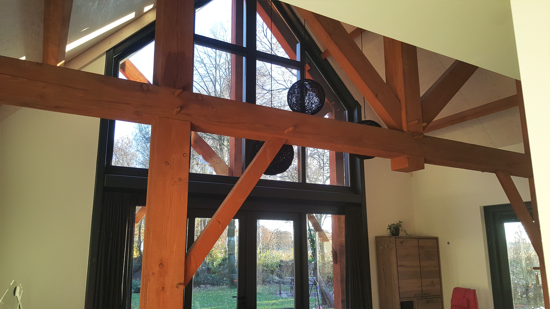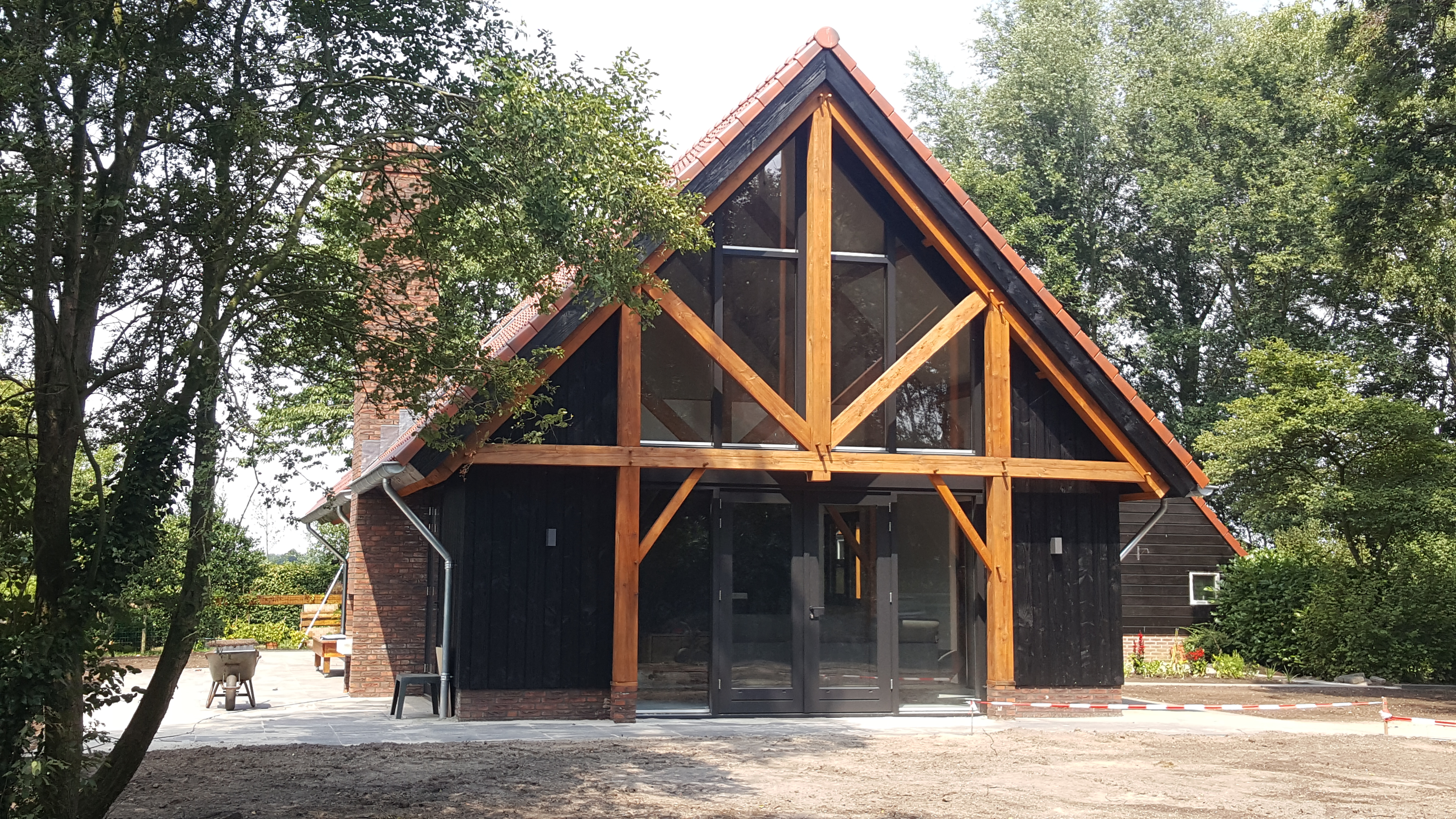 De houtconstructie van de schuurwoning bestaat uit 171 stukken fijnbezaagd Lariks/Douglas, welke grotendeels met houten pen-en-gat verbindingen aan elkaar zijn verbonden.