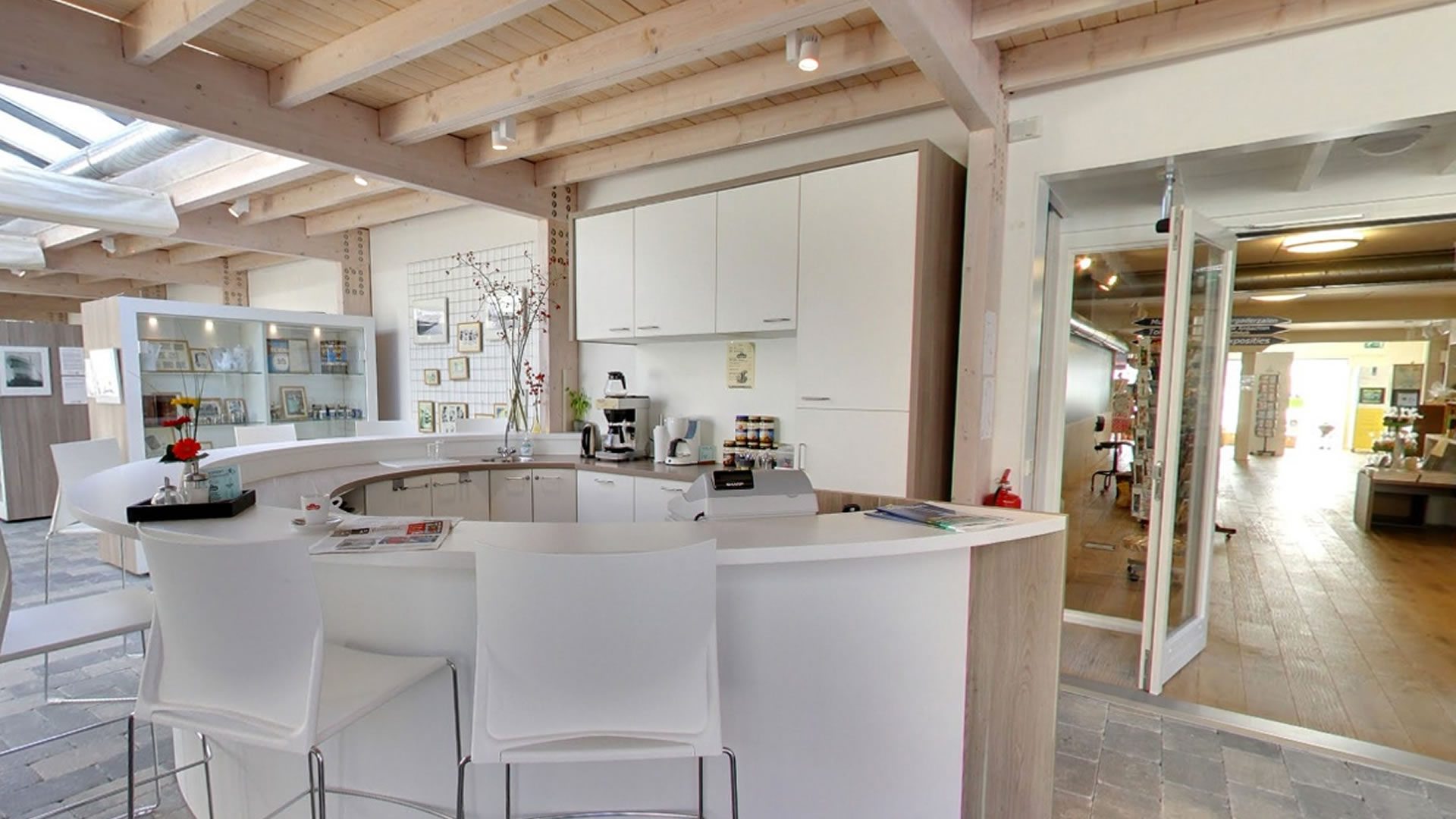 Op het braakliggende terrein tussen de bakkerij en het bankgebouw is een tuinpaviljoen van glas en gelamineerde houten spanten gebouwd. Het tuinpaviljoen verbind de beide gebouwen.
